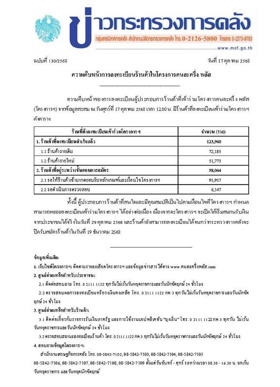 หมายเหตุของผู้ประกอบการร้านค้าที่เข้าร่วมโครงการคนละครึ่ง พลัส (โครงการฯ) จากข้อมูลสะสม ณ วันศุกร์ที่ 17 ตุลาคม 2568 เวลา 12.00 น.